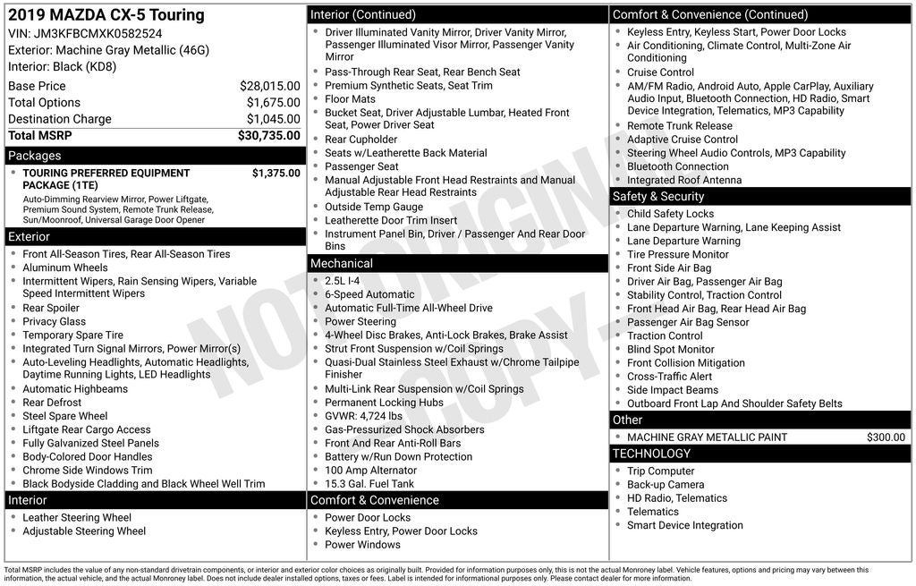 Machine Gray Metallic 2019 Mazda CX-5 Touring 4D Sport Utility AWD 6-Speed Automatic SKYACTIV® 2.5L 4-Cylinder DOHC 16V