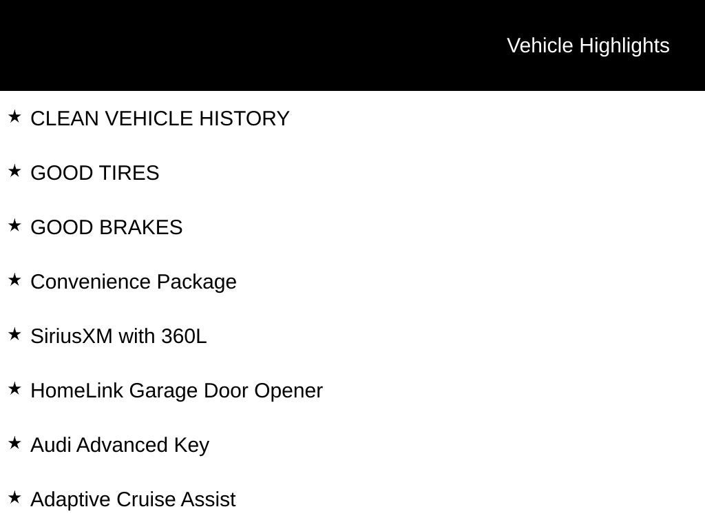 - Radio: MMI w/10.1" Touchscreen Display -inc: Audi connect CARE (limited time subscription), Audi smartphone interface w/wireless Apple CarPlay and Android Auto and Bluetooth w/audio streaming